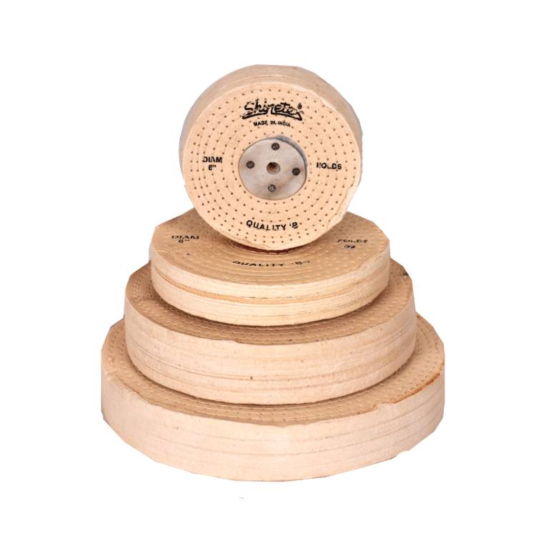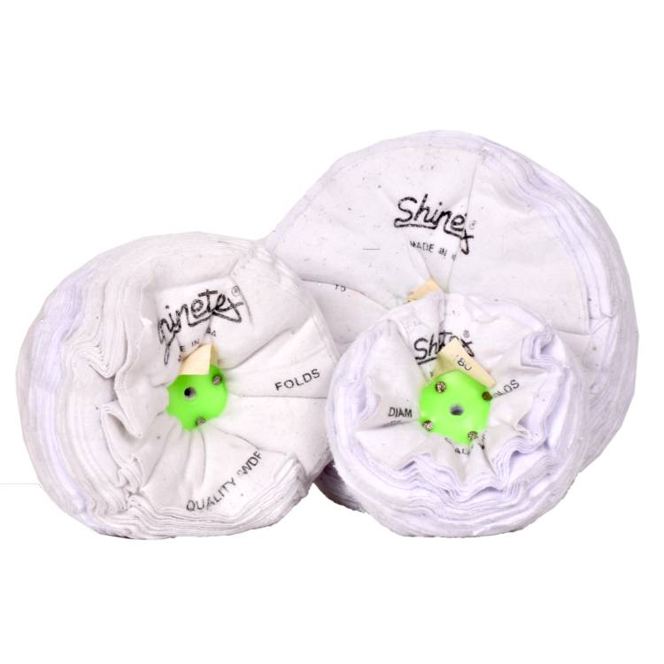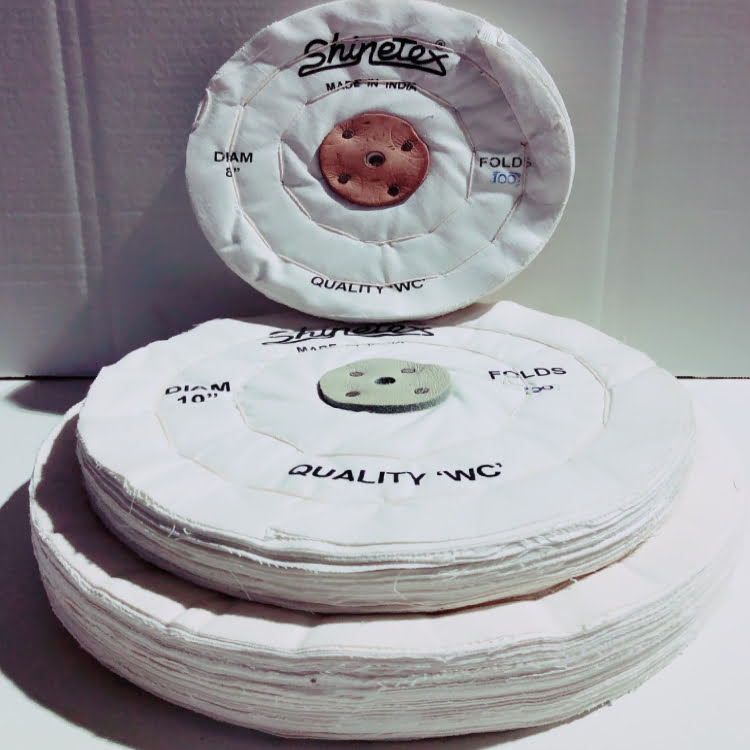 Quality G mop for polishing silver, plastics and brassware. Used also for coloring of brass, copper, acrylic, and pewter after polishing. Also available in smaller diameters with sewn centers.
